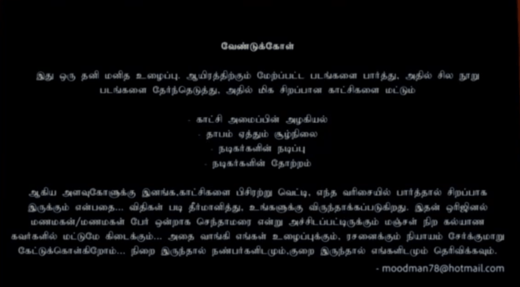 Also the name of the Video Store where the boys buy a porn CD, of all the name in the world it’s named ‘ANNAI VIDEOS‘ and also when the lady takes out the porn cd which is inside a drawer,we see a CD of 1979 k.Vijayan’s film called Thirisoolam.The thing about visual comedy in Super Deluxe is how these little details does not end up being only comedy but also adds to the overall vision of the film,what I mean here is you only associate words like ‘Annai’ and ‘Thirisoolam’ only with that of sacred,right.But look where Kumararaja uses them, in a fucking video store that sells porn disks.Apart from these, the most wtf moment for me is the ‘Request Card’ [fig:8] from the man (moodman78@hotmail.com) who made the porn compilations.